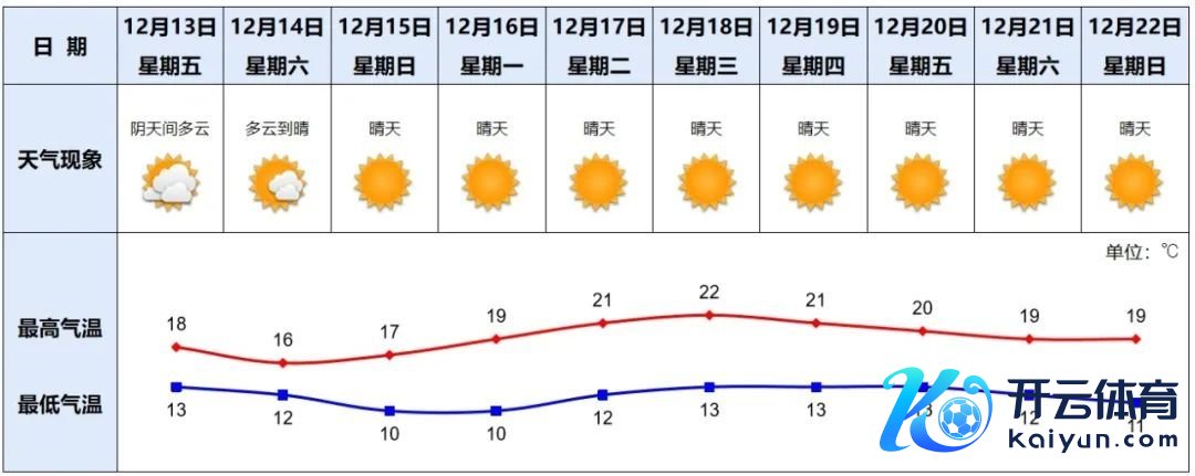 12月13日,阴天间多云,部分时候可见阳光,13~18℃,相对湿度45%~75%;14日,多云到晴,12~16℃;15日,好天,10~17℃。(荔湾区风光台12月12日17时发布)