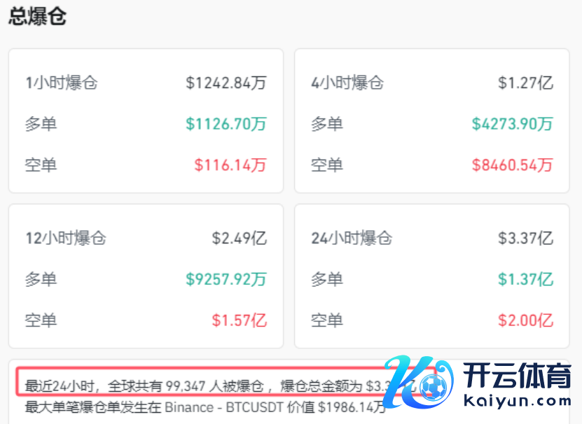 coinglass数据显露,24小时内,加密货币市集爆仓东谈主数跳跃9.9万东谈主,爆仓金额达到3.37亿好意思元。其中,多单爆仓1.37亿好意思元,空单爆仓2亿好意思元。