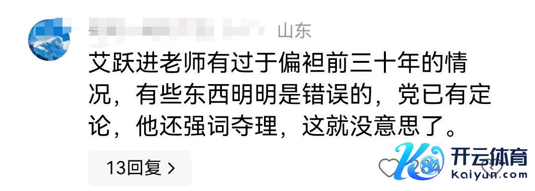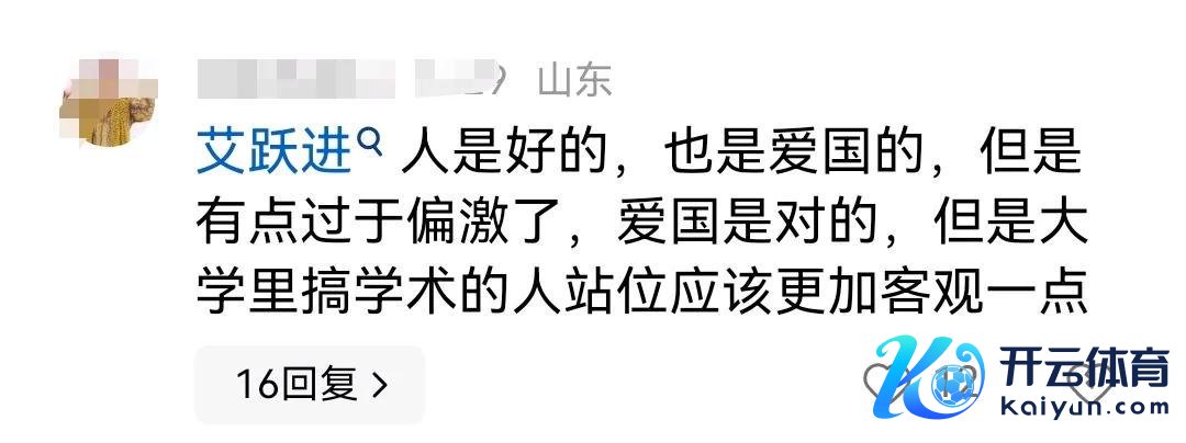 ——山东网友:艾跃进东谈主是好的,亦然爱国的,但是有点过于偏激了,爱国事对的,但是大学里搞学术的东谈主站位应该愈加客不雅少许。
