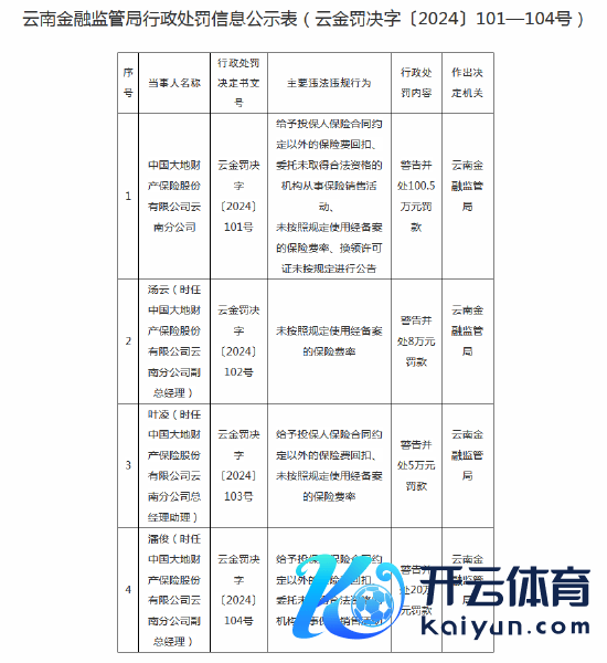 1月2日金融一线讯息,国度金融监督责罚总局云南金融监管局行政处罚信息公示表(云金罚决字〔2024〕101—104号)败露,中国地面财产保障股份有限公司云南分公司存在以下违警违游记径:予以投保东谈主保障公约商定之外的保障费回扣、寄托未赢得正当履历的机构从事保障销售手脚、未按照法规使用经备案的保障费率、换领许可证未按法规进行公告。地面财险云南分公司被罚100.5万元。