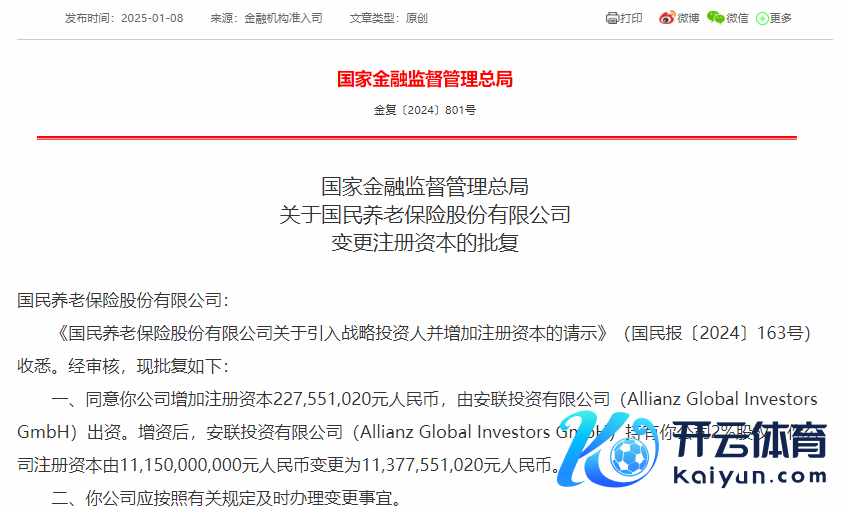 1月8日,国度金融监督处理总局发布批复显露,甘心国民养老保障股份有限公司(简称“国民养老”)增多注册老本2.28亿元,由安联投资有限公司(简称“安联投资”)出资。