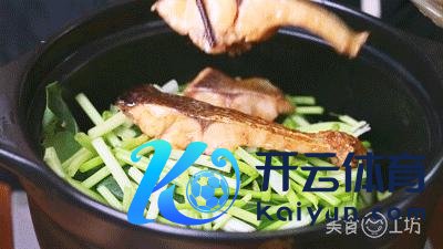 4. 砂锅内底部放入切好的洋葱,小青菜洗净铺在锅中,加芹菜段,终末放入鱼块,将腌鱼汁一同倒入锅中。