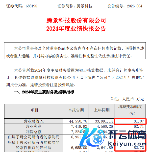 2月21日,腾景科技发布事迹快报领悟,公司2024年的生意总收入、归母净利润、扣非后净利润同比区别增长31.07%、66.89%和82.73%。