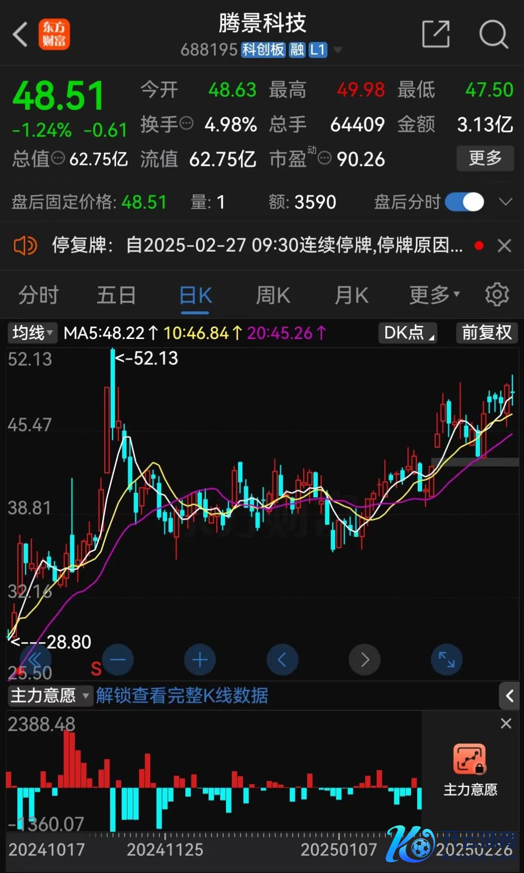 腾景科技权谋自2月27日开市起停牌。限制2月26日收盘,公司股价报48.51元/股,总市值为62.75亿元。限制2024年第三季度末,公司股东东谈主数为9365户。