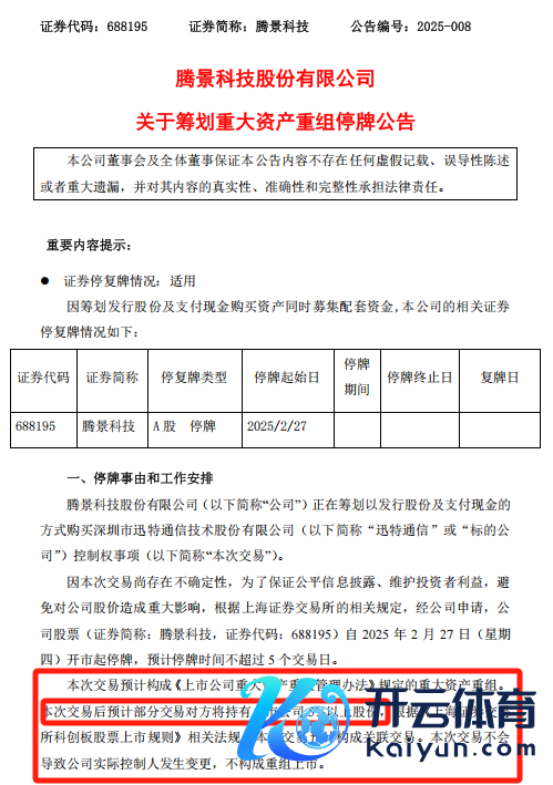 2月26日晚间,腾景科技公告称,公司正假想以刊行股份及支付现款形式购买深圳市迅特通讯期间股份有限公司(以下简称迅特通讯)戒指权事项,瞻望组成紧要钞票重组和研讨往来。