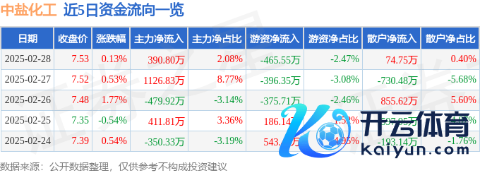 本站音书,界限2025年2月28日收盘,中盐化工(600328)报收于7.53元,高涨0.13%,换手率1.7%,成交量24.9万手,成交额1.88亿元。