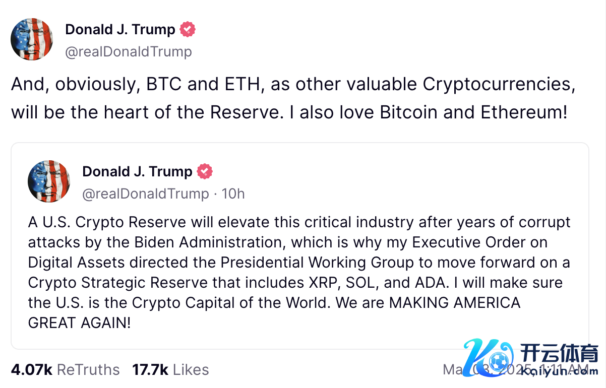 随后,XRP、SOL、ADA等加密货币马上拉涨。特朗普后续再度发文称,“光显,比特币(BTC)和以太坊(ETH)和其他有价值的加密货币同样,将成为储备的中枢。我也心爱比特币和以太坊!”