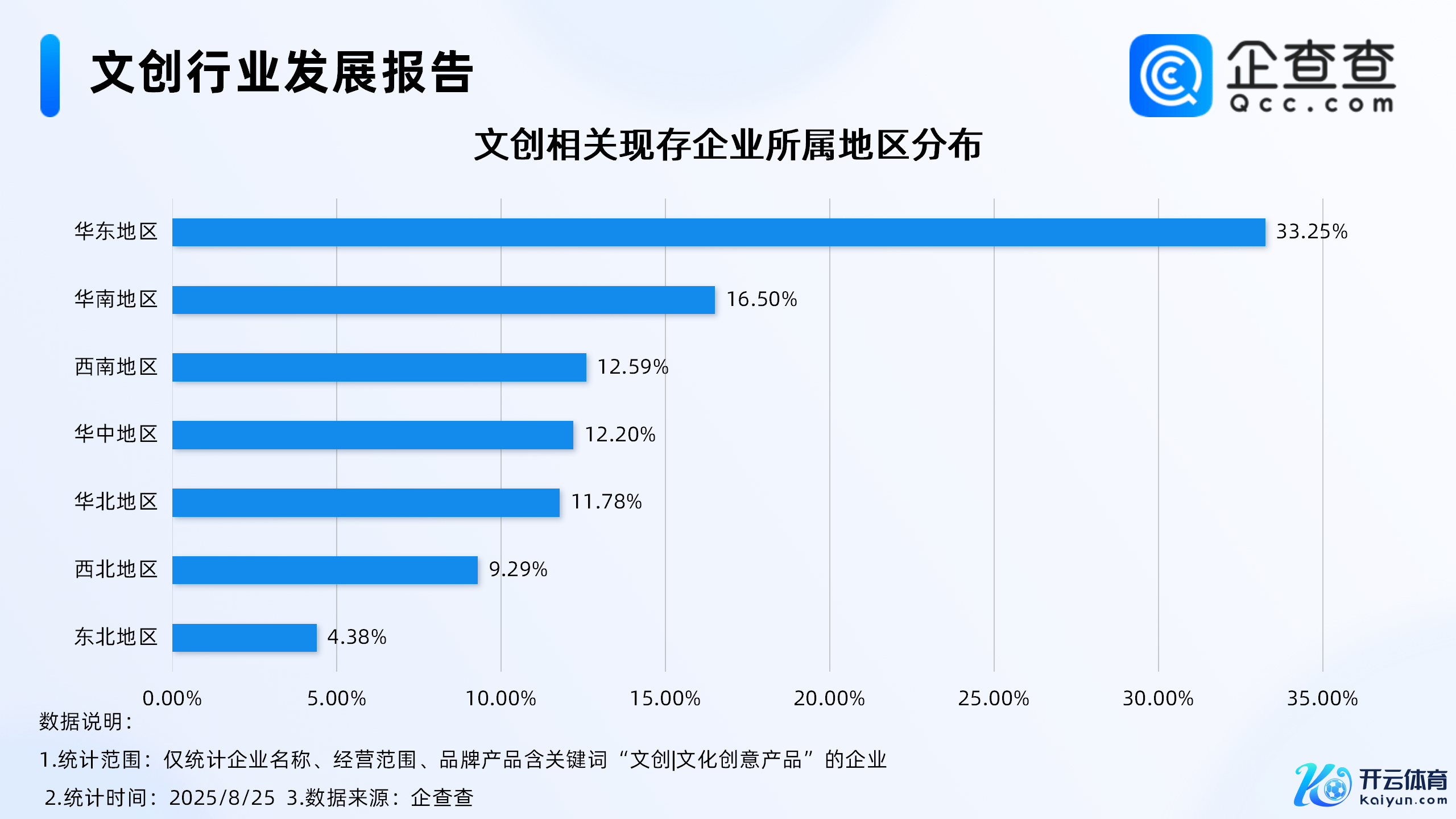 企查查数据表示,抑遏8月下旬,国内文创干系现有企业达3.02万家,主要漫衍在华东地区,占比达33.25%,其次为漫衍在华南地区的干系企业,占比达16.5%。漫衍在西南地区、华中地区、华北地区的干系企业,在寰宇存量占比均在11%-13%之间。